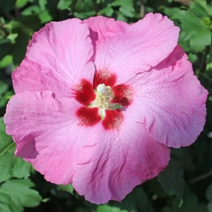 Buy Aphrodite Althea online. ‘Aphrodite’ is a medium-sized upright growing, slender, well-branched shrub, with bright green serrated leaves. Tolerates a wide variety of soil and moisture conditions. Abundance of single pink flowers are produced in late summer. Note: Althea is considered a woody shrub or tree and will not die back to the ground in winter like hardy hibiscus.