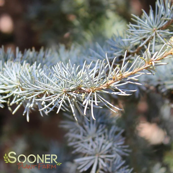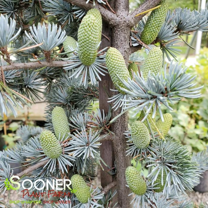 Buy Blue Atlas Cedar online. Definite specimen use, this tree makes a statement all by itself, With powder blue, somewhat silver needles and a pyramidal shape when young, becoming flat-topped with horizontal spreading branching when older.