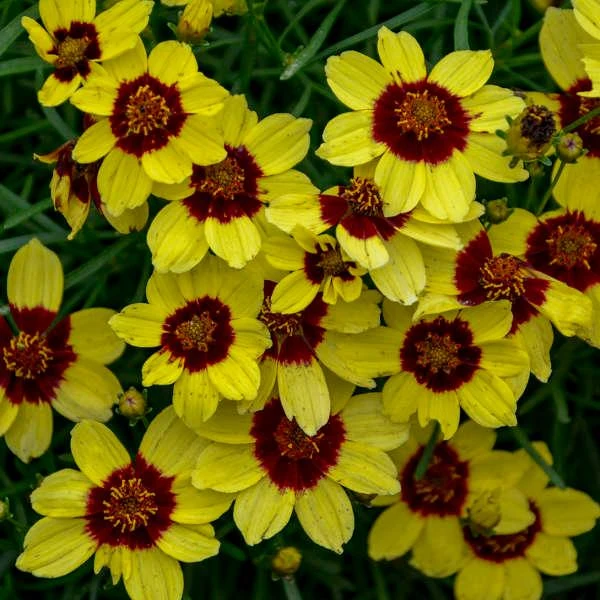 Buy Sizzle & Spice™ Sassy Saffron Tickseed online. Lemon yellow flowers with an intense maroon red eye adorn the perfectly rounded habit of feathery green foliage in summer. This is a brighter, sunnier yellow than the warm, golden yellow of ‘Curry Up’.
